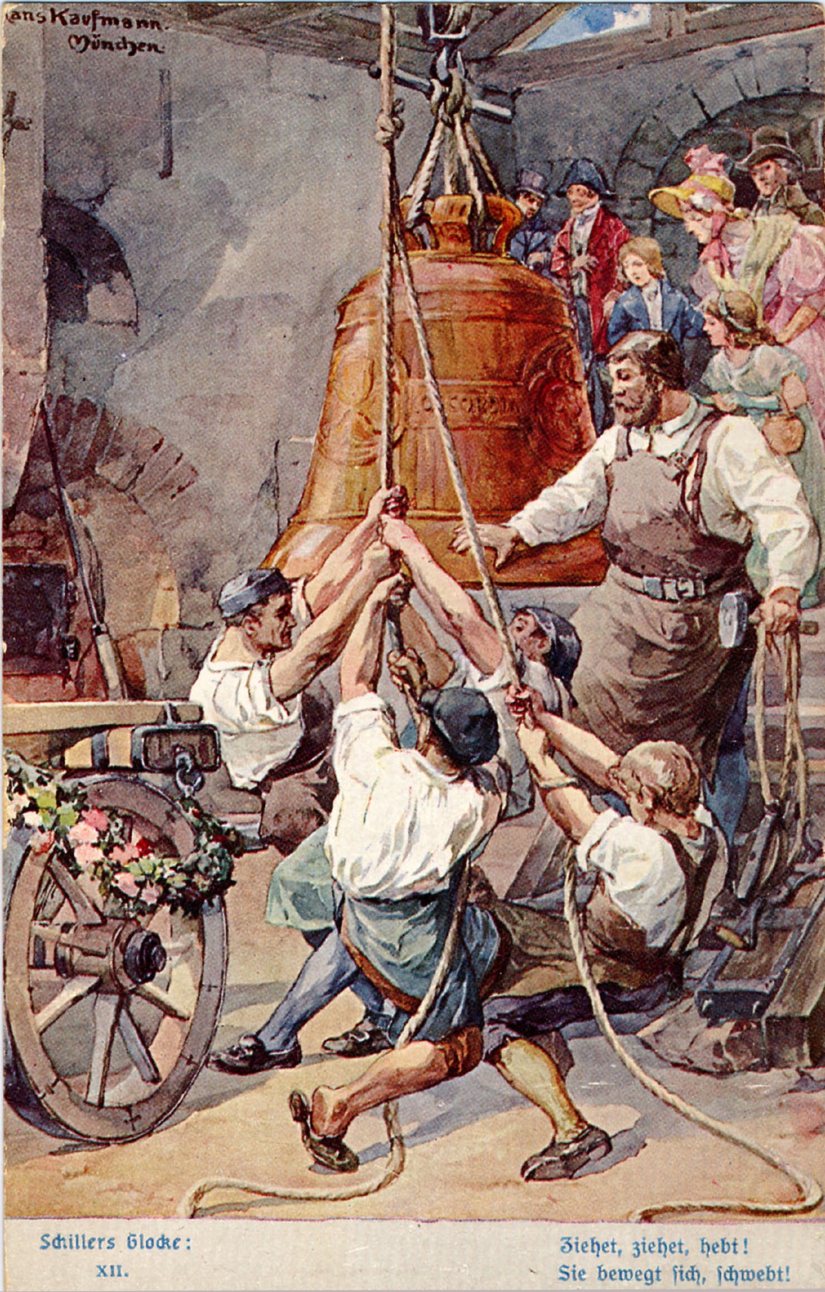 Ich bin jetzt an mein Glockengießerlied gegangen und studire seit gestern in Krünitz Encyklopädie. Dieses Gedicht liegt mir sehr am Herzen. Und Goethe antwortet: Ich freue mich wenn Sie noch für diesen Almanach mit der Glocke zu Stande kommen! Denn dieses Gedicht wird eins der vornehmsten und besonderen Zierden sein. Erst zwei Jahre später kann Schiller hörbar erleichtert über die Vollendung seiner Glocke berichten. Im Mittelpunkt steht der Glockengießer. Er erklärt den Gesellen das Glockenformen und damit auch uns. Das Werden der Glocke, zu dem sich "ein ernstes Wort" geziemt, regt den Meister zu immer neuen Betrachtungen an. | |